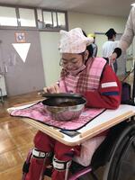 小学部の低学年の子どもたちは、生活学習室に大集合していました。教室の中は、パンケーキのあま~い香りが広がっていました。給食後のデザートですね。今年も元気にがんばれましたね。