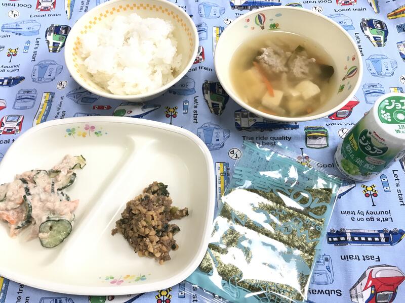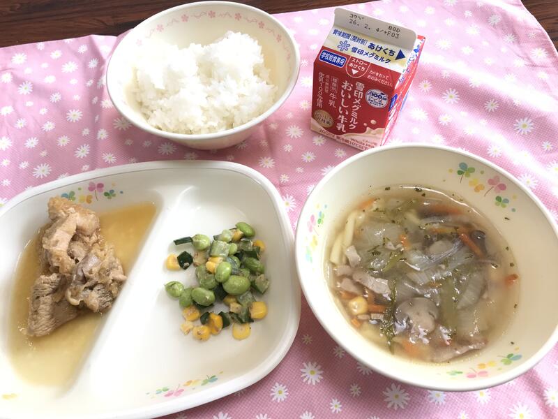 「チキンでアロハ」は、パインの甘酸っぱさと生姜・にんにくの風味が調和し、食欲を高める一品でした。コロコロサラダは、枝豆・きゅうり・コーンの食感が楽しく、お箸の練習にもなりそうでしたね。なお、スプーンも添えられており安心して食べられる工夫がうれしいです。マカロニスープは具材の旨味がやさしく広がり、ごはん・牛乳を含め栄養バランスの良い献立でした。