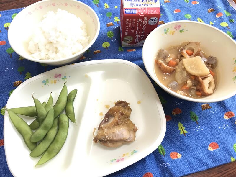 ごはん ぎゅうにゅう とんじる とりにくのごまずがけ えだまめ