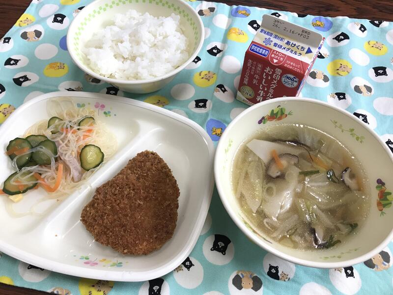 ごはん ぎゅうにゅう コーンコロッケ どさんこじる ヨーグルトあえ
