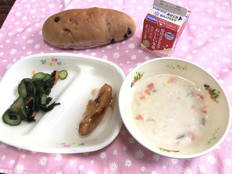 チョコチップパン ぎゅうにゅう チキンウインナー クリームシチュー あおじそふうかいそうサラダ