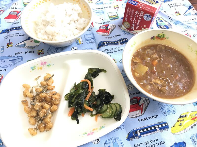 本日の献立は、子どもたちに人気のポークカレーを中心に、栄養バランスがよく整えられた内容でした。カレーは野菜の甘みと豚肉・ひよこ豆の旨味がほどよく溶け合い、辛さも控えめで食べやすい味でした。だいずとちりめんじゃこのごまがらめは、香ばしさとほどよい甘さで、子どもたちにも親しみやすい一品です。きゅうりの酢の物はさっぱりとしており、カレーとの相性も良く、全体として満足感のある献立でした。