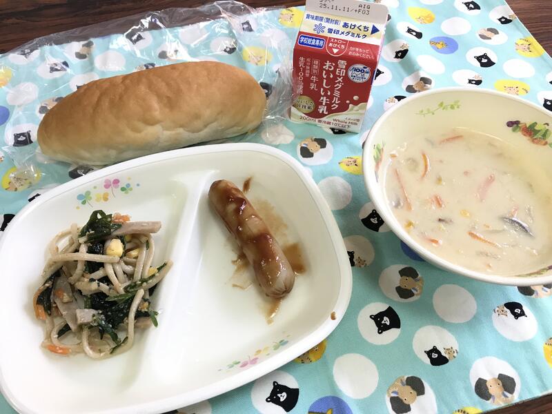 今日の給食は、こめこパンのやさしい甘さと、ぎゅうにゅうコーンポタージュのクリーミーな味がとてもよく合っていて、ほっとする美味しさでした。ポークフランクは食べごたえがあって、子どもたちも喜びそうです。もちむぎめんは香ばしくて、ごまの風味が効いていて、サラダも彩り豊かで栄養バランスばっちり。季節感もあって、工夫された献立だと感じました。