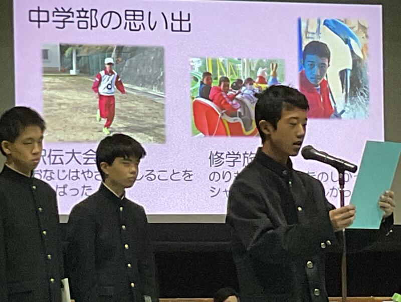 2月25日に「卒業生を送る会」を実施することができました。これまでの練習を活かし、クラスや学部が一つになって取り組む姿が見られました。在校生の発表、3年生は各クラスの発表、全学年揃っての音楽発表など「おめでとう」「ありがとう」の思いのこもった、笑顔あふれる温かい会になり、生徒たちの心の成長を感じることができました。