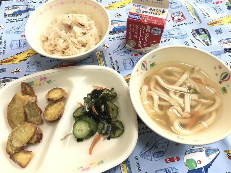 さつまいもの天ぷらは甘みがあり、衣も軽く仕上がっていて児童生徒が食べやすいと感じました。きゅうりとじゃこの酢の物は、さっぱりとした味付けで、全体の献立のアクセントになっていました。炊き込みごはんは少なめの量設定で、うどんとの組み合わせも無理がなく、食べ残しを減らす工夫が感じられました。栄養面・味ともによく配慮された献立だと思います。