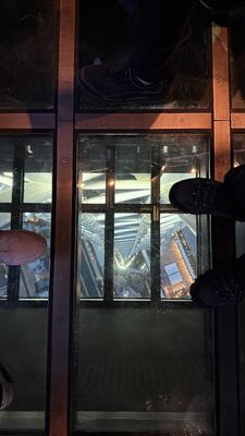 夕暮れ時のスカイツリーに登りました。エレベーターで350メートルを一気にのぼります。写真を数枚撮る間にもう到着です。曇り空で夕日は見ることができませんでしたが、夜景の明かりが少しづつともり、夜になっていく東京を感じることができました。