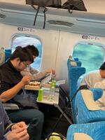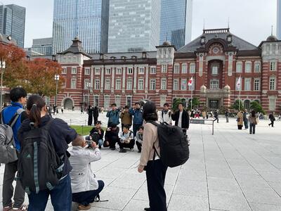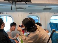 新幹線ひかりでJR東京駅まで、3時間半です。新幹線の中では、おやつOKです。到着するまでの時間を友達や先生と楽しい会話やトランプゲームで盛り上がりながら過ごしています。あっという間についてしまいそうですね。