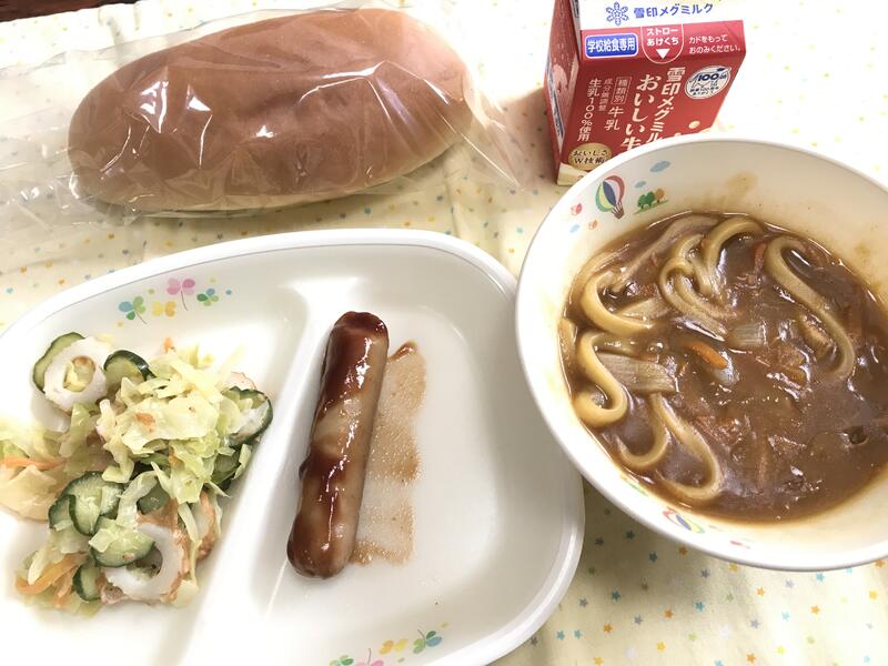 本日の給食は、パンとぎゅうにゅうに加え、カレーうどんの温かさが体にしみる満足感のある献立でした。ポークフランクの旨みがよいアクセントになり、野菜がしっかり入ったカレーは食べ応えがありました。ちくわとキャベツのごまドレあえは、ノンエッグのドレッシングでさっぱりと仕上がり、食感も楽しめました。全体として栄養のバランスがよく、子どもたちも喜んで食べられる献立だと感じました。
