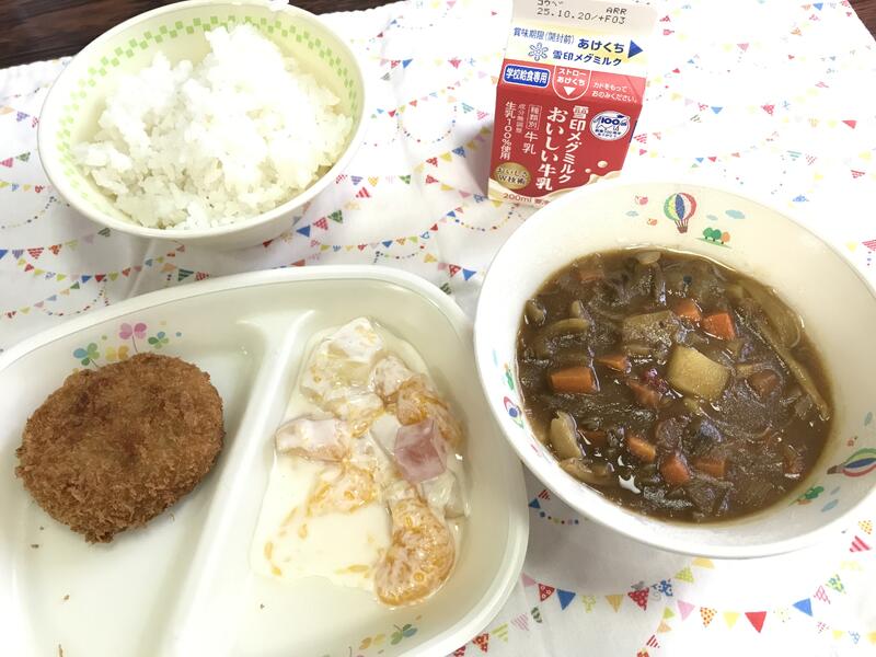 本日の給食は、ごはん・牛乳・きのこカレー・たまねぎコロッケ・ヨーグルトあえ・カクテルゼリーでした。カレーにはまいたけやしめじなど秋の味覚がたっぷり。サクサクのコロッケをのせて食べると、さらに美味しさアップ!校長先生は「カレーは大好き。中でもコロッケカレーは最高!」です。デザートのゼリーとヨーグルトあえも彩り豊かで、楽しい給食でした。