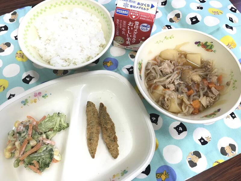 ごはん 牛乳 とんじゃが きびなごいそべフライ カラフルサラダ