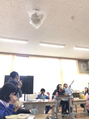 小学部の低学年の子どもたちは、生活学習室に大集合していました。教室の中は、パンケーキのあま~い香りが広がっていました。給食後のデザートですね。今年も元気にがんばれましたね。