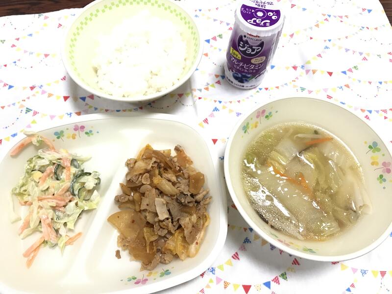 ごはん のむヨーグルト キムタク ワンタンスープ コールスローサラダ