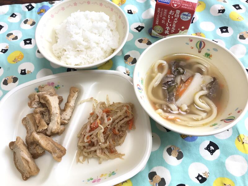 ごはん ぎゅうにゅう こぎつねに もやしのごまあえ うどん