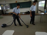 先輩方が3年間使ってきた音楽室を念入りに掃除機掛けをする1年生。