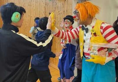 最後は記念撮影。そして退場時には、クラウンのお二人が出口でハイタッチや笑顔で見送り、子どもたちも笑顔で応えていました。