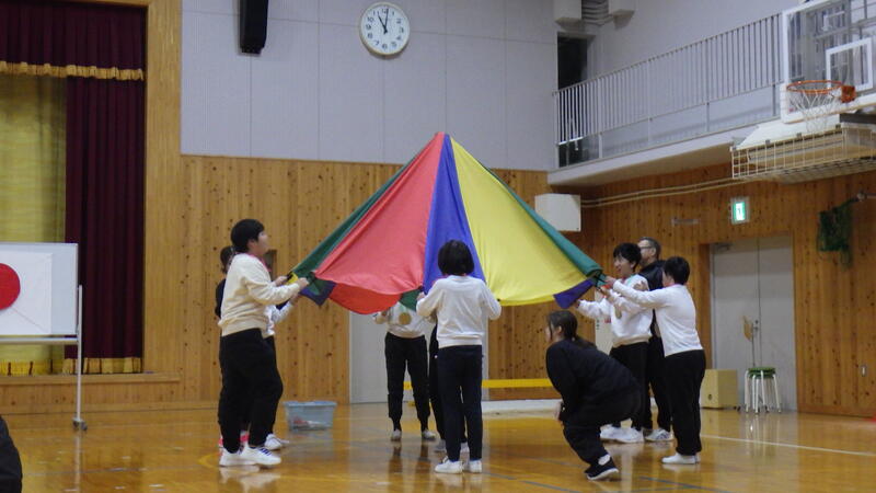 最後は、フィナーレとしてパラバルーンを行い、学年目標である「仲間」を表現しました。生徒一人ひとりの違いに苦戦しながら、体育で何度も練習に励みました。本番の息の合った演技に、何事にも諦めず挑戦する生徒たちの強い気持ちが一緒にいた学年の先生にも伝わってきました。