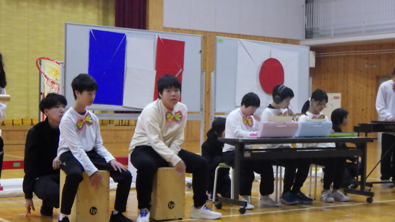 りと舞台を華やかに彩りました。これらの装飾は美術の時間に学年全員で制作したものです。