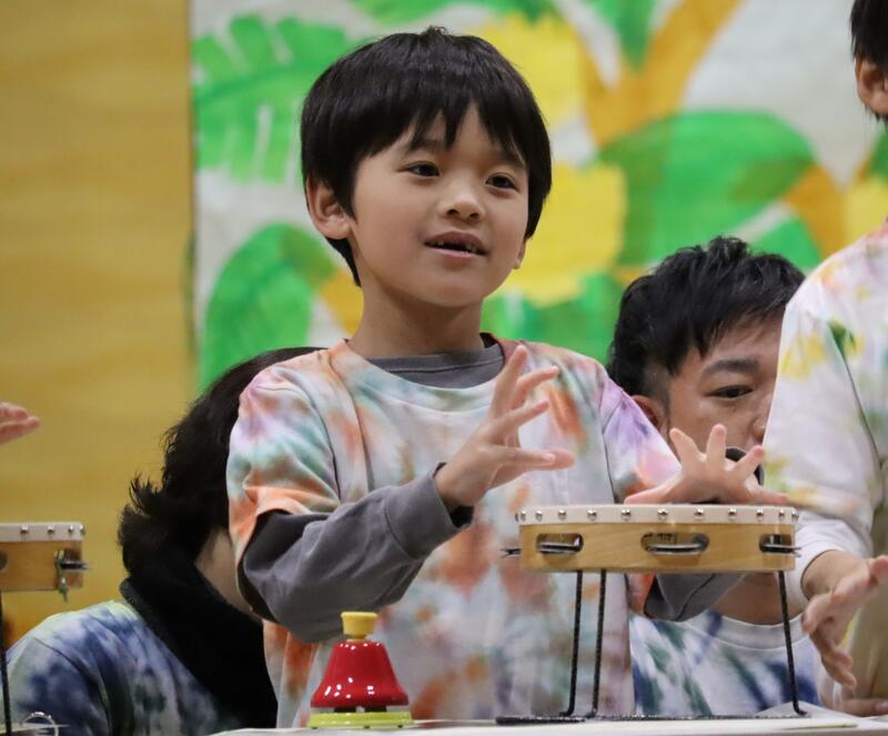 第二場面では、みんなで協力して集めたフルーツで、ミックスジュースを作ります。『ぼくのミックスジュース』の曲に合わせて、スタンドタンバリンとベルハーモニーを、軽やかなリズムで鳴らしました。おいしいジュースができるように、みんなで心を込めて演奏しました。