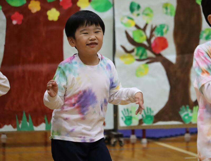 第三場面では、ジュースをぐるぐる混ぜて、おいしいミックスジュースの完成です。ジュースを混ぜる様子を歩く動きで表し、完成した喜びをダンスで表現しました。