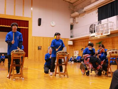 ペアクラスで和太鼓を演奏しました。「すすめ すすめ」のリズムに乗せて、元気な掛け声とともに一打一打に想いを込めて、全力で取り組みました。