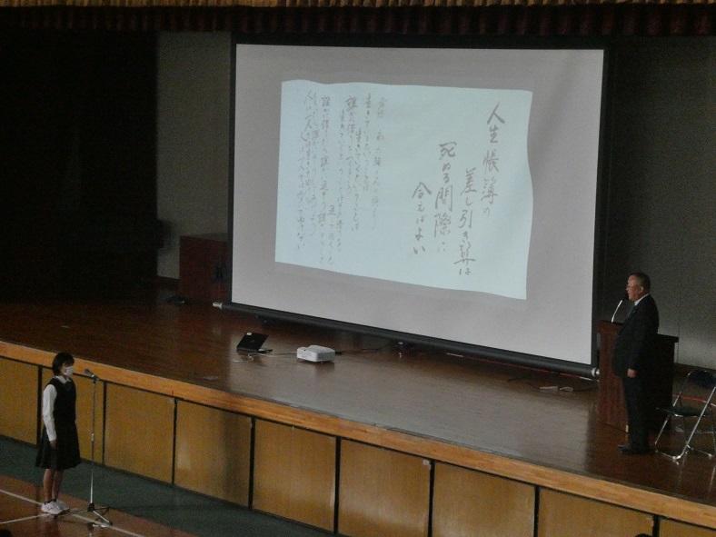 本校の歴史について校長先生からお話しがあり、卒業生である山崎大樹様より講演をしていただきました。「千鳥の恩返し」という演題で、ふるさと淡路島と淡路人形浄瑠璃のために長年取り組んでこられた活動について語っていただきました。