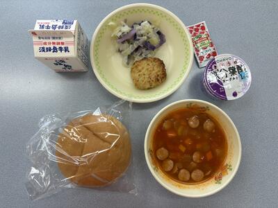 バンズパン 牛乳 ハンバーグ ゆで野菜 ミネストローネ 鉄分ヨーグルト