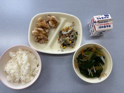 ごはん 牛乳 揚げ鶏のレモン漬け 海と畑のサラダ 小松菜のスープ