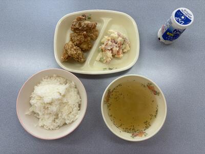 ごはん ジョア(プレーン) からあげ ポテトサラダ コーンスープ(コンソメ仕立て)