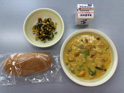 コッペパン 牛乳 かぼちゃのシチュー 枝豆サラダ
