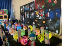 作品展示では、みなさまの心を和やかに灯す光をランプシェードに、子どもたちの夢と未来をロケットと宇宙(そら)に託しました。一つ一つの作品に込めた思いが、伝わりますように☆ 舞台発表では、「ミュージック万博2025」と題し、ダンス、歌唱、楽器紹介、合奏と盛だくさんの内容でお届けしました。どの発表も子どもたちの努力と成長が見られ、私たち教職員も感動しました。万博の年にちなみ、4月から世界の国々について学習をしてきました。その最後を締めくくる最高のパフォーマンスとなりました。ご観覧いただきましたみなさま、ご声援ありがとうございました。