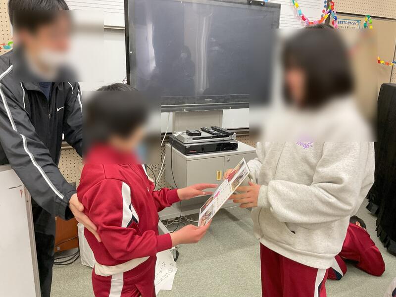生活の学習で6年生とのお別れ会がありました。在校生が卒業生のためにプレゼントを準備して渡しました。みんなでゲームをして楽しい時間を過ごしました。