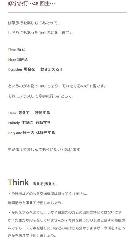 48回生修学旅行 出発 投稿日時 : 2023/11/06 教頭 おはようございます。 生憎の雨模様です。集合時間に全員到着し、予定より少し早い出発となりました。 沖縄に行く前に生徒が作成した修学旅行で心掛けたいTPOを載せておきます。