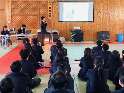 今朝の千種町は7℃(午前8時時点)と比較的暖かい朝を迎えました。暖かいのは嬉しいですが、11月の登校日も今日が最後というのに極寒の千種ではないのはなんか変な感じです。これから本格的な厳しい寒さがやってくるのでしょうが、このギャップにやられないよう注意していきたいと思います。 さて本日5限、1年生を対象とした「キャリア教育に関する公開授業」があり、県教委や近隣の学校からの参観を受けるLHRが行われました。もちろん私も参観しましたが、1年生にとって最も身近な人生の先輩である3年生から話を聞き、自分の進路と向き合うとともに、今自分ができることは何かを考えることを目的として実施したのです。