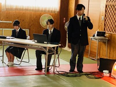 その後、英語スピーチコンテスト全国大会に出場する磯崎さんとライフル射撃で国民スポーツ大会に出場する一坪くんへの壮行会が行われ、生徒を代表して名田生徒会長から「緊張すると思うが生徒みんなで応援しているので頑張ってきてほしい!」と激励の言葉が伝えられると、磯崎さんは「初めての全国大会で英語で自分の気持ちを表現するのは緊張すると思うが、頑張ってきます!」と挨拶、一坪くんも「この大会が競技生活最後になるので、悔いのないよう頑張ってきます!」と決意が述べられました。二人へのご声援をよろしくお願いいたします。