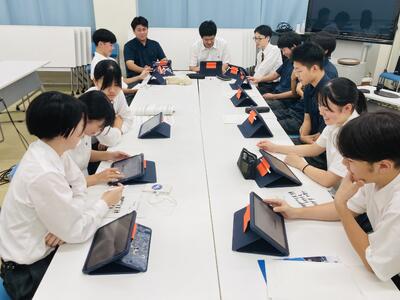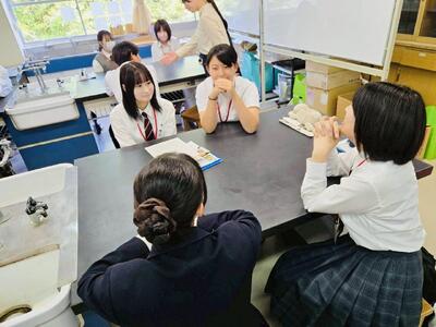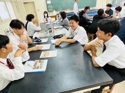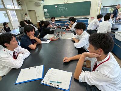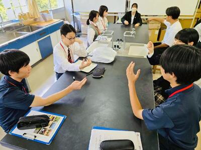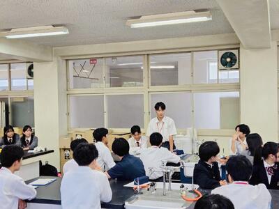 本校は、地元小中学校と様々な形で連携事業を行っていますが、校種を越えて実施する「交流授業」というものがあります。高校の教員が中学生や小学生を対象に授業を行うというもので、生徒も教員も互いに新鮮な学びを得る機会として定着しています。