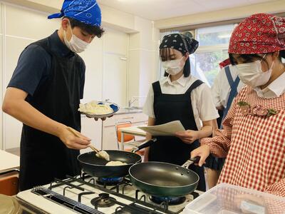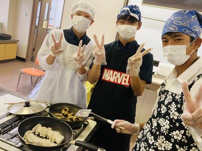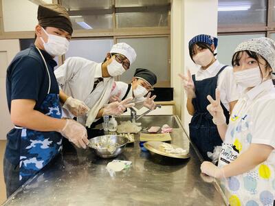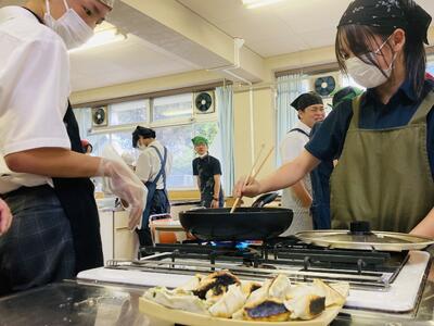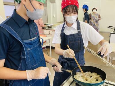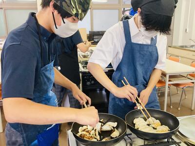 まずはボールの中に挽肉、ニラ、キャベツ、ニンニク、調味料などを混ぜ合わせ餡を作る工程から実習はスタート…。そしてその餡をギョウザの皮に包み形を整えていきます。売り物に近い芸術的なギョウザから個性豊かなギョーザまで様々なギョーザがお皿に並べられていきます。そして、熱したフライパンにギョウザを投入…生徒たちは楽しそうにその実習に取り組んでいきます。しかし、ここから数々のハプニングが…白煙があがり「あっ、真っ黒に焦げてるー!」「ギョーザ詰め込み過ぎー!」と柴原先生の声が鳴り響いたと思いきや、ひっちゃかめっちゃかの班が続出。真剣に取り組んでるがゆえに見ていて笑ってしまいましたが、なんとか各班ごとに焼きギョーザが完成し給食の一品として美味しくいただきました。めでたし、めでたし。
