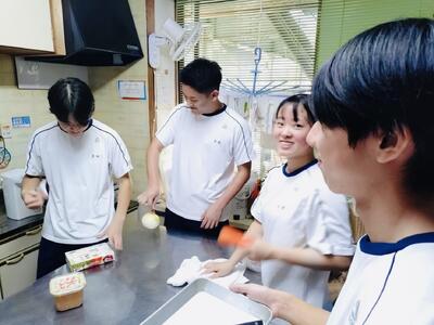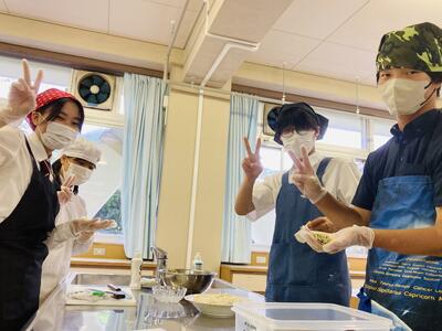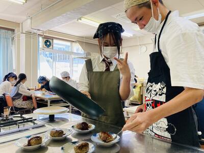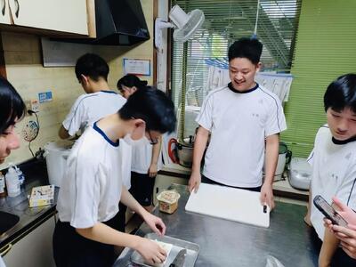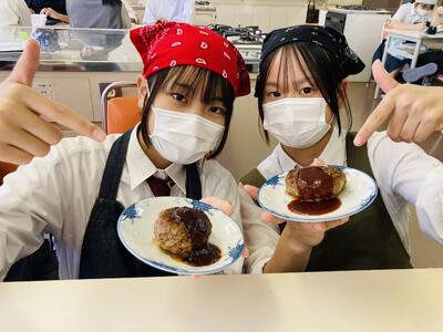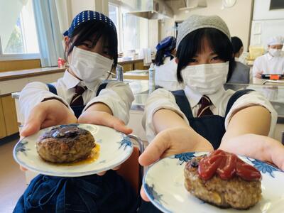 さて1年生の科目「家庭基礎」では2学期に入ってから毎週のように調理実習が行われています。生徒たちのリクエストを聞いていただき何を作るか決められているそうですが、今日のテーマは「ハンバーグ」でした。玉ねぎをみじん切りして炒め挽肉と合わせて成形し焼き上げるのですが、私が伺ったときはすでにほぼ完成していました。「校長先生、私たちの班のハンバーグ食べてください!」と生徒たちがハンバーグを試食させてくれ、優しい生徒たちの気持ちとジューシーなハンバーグの味に思わず笑みがこぼれました。いやぁ、生徒の皆さん、ありがとう!!生徒たちの愛情こもったハンバーグ、まずかろうはずがありません。1年生の皆さん、調理実習を通して料理のレパートリーを増やしてくださいね。