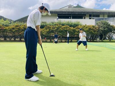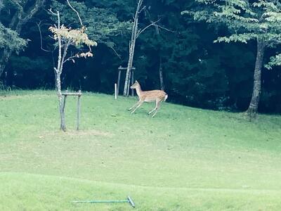 さて本日は午前中、2,3年生のアクティブ(ゴルフ)がありました。いつものように林ティーチングプロによるゴルフの座学を受けた後、生徒たちはマイクロバスに乗って千草カントリークラブへ向かいます。私もこの爽やかな陽気に誘われてゴルフ場へ向かうと、イキイキとゴルフに親しむ生徒たちの姿を見ることができました。人数が多いため、全員がコースに出て練習することはできませんが、主に3年生はコースでの実践練習、2年生はドライビングレンジでアプローチ練習やパター練習場でパター練習をしていました。いやぁ、最高のロケーションの中、先生方とともに美しく整備されたコースを回りながらのゴルフ、最高ですねー。コースを歩いていると鹿がピョンピョンと出没し、生徒たちのゴルフを見学している様子も見られました。こうした恵まれた環境の中で、生徒たちはのびのびとイキイキと授業ができる!千草カントリーの皆さま、林ティーチングプロをはじめ、多くの皆さまのご協力あっての授業に、感謝感謝です。