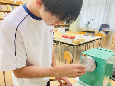 さて5,6限、3年生アクティブ(木工)の授業では「木のおもちゃ作り」が行われています。特別非常勤講師の野村先生にご指導いただき、少しずつ形が出来上がってきているようで、生徒たちも楽しそうに実習に励んでいました。昨年度末、クラウドファンディングによって得られた寄付金を活用して新たな機械も購入させていただき、より効率的な作業が実現できています。寄付いただいた皆さまに心から感謝申し上げます。生徒の皆さん、完成が楽しみですね。出来上がったものを地元こども園に寄贈し、子どもたちが喜んでくれる様子が目に浮かびます。その日のために、今後も頑張って仕上げてください!