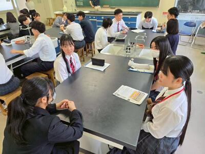 本日、5限は千種中学校7年生を対象とした「アユの解剖」をテーマとした授業があり、本校の筏教諭が熱い熱い授業をしてくれました。まず、生きた元気のよいアユを手づかみしてポリ袋に入れ、麻酔で眠らせるところから授業はスタート…、生徒たちはキャーキャー言いながら生きのいいアユの手づかみに悪戦苦闘します。そして、麻酔が聞き始めるまで筏先生のアユの一生についての説明を聞きます。アユという身近な魚でありながら、その生態はとても不思議でまたたった1年しか生きられないという実態を知り、生徒たちはじっと話を聞き入っています。そして、「私たちの実験のために命を捧げてくれるアユたちに感謝して、しっかり学んでほしい!」と筏先生…生徒たちは「ハイ!」と大きな返事をしながらいよいよ解剖が始まっていきます。筏先生が最初に大型モニターを見ながらデモンストレーション…アユの体にハサミを入れ、臓器の場所や役割について説明しました。そして、いよいよ生徒たちが実践します。生きているアユにハサミを入れることは勇気がいることですが、生徒たちは器用にハサミを使用して解剖を進めていきました。死んでいるようでピクピクと心臓が動いている様子、精巣と卵巣の違い、肺がないけれどエラがあることなど、アユの臓器の特徴をしっかりと学んでくれたと思います。