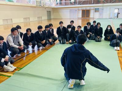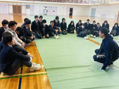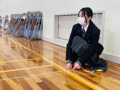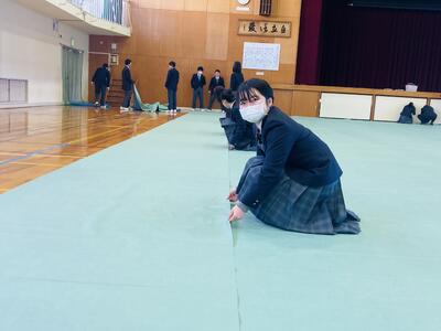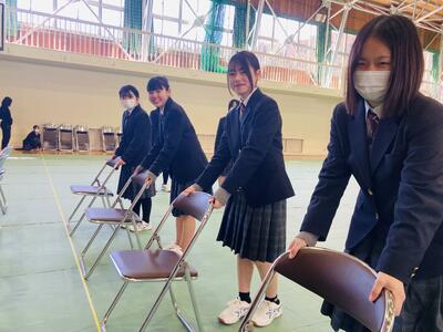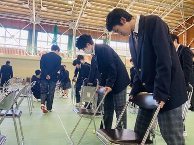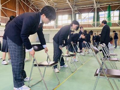 さて本日の3限と6限に2月27日(金)に挙行される「卒業証書授与式」に向けた会場準備が行われました。私は3限に1年生が準備している様子を見させてもらいましたが、冷え切った体育館で井川先生の指導のもと、みんなホントによく動いてくれました。シート引きの後、イスを等間隔に並べていきますが、誰一人手を抜いている人はいません。指示を受け自分なりに考え意欲的に取り組む姿は千高生のホントに素晴らしい所であり、約1時間で会場の大枠は出来上がりました。いやぁ、1年生の皆さん、よう動いてくれました。明日からは学年末考査となりますが、勉強の方も抜かりなく頑張ってくださいね。
