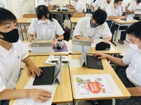 若手教員を中心にさっそく教室でICTを活用した授業を実践しており、今日は授業の様子を見学させてもらいました。プロジェクタを活用した授業では、授業担当者が事前にスマートフォンに取り入れたプレゼンデータをプロジェクタにつなぎスクリーンに投影。驚いたのは、電子黒板機能が搭載されており、電子ペンでスクリーンに文字を書き加えながらより詳細な解説ができていました。また、英会話の授業においては、タブレット型ノートパソコンを一人一台使用して、調べ学習が行われていました。自分の好きなテーマを決め、調べた内容を英訳し、後日みんなの前で英語で発表するようです。