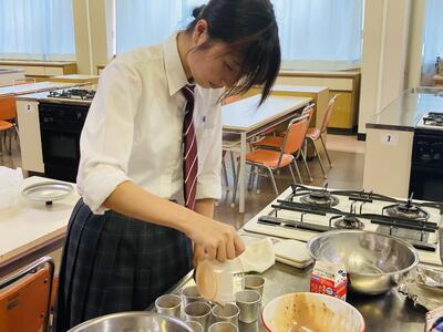 本日午後から、各学年ともにLHRや総合的な探究の時間があり、もう校内どこを歩いていても生徒たちが様々な活動をしておりメチャメチャ忙しく動き回りました。全部は紹介しきれないのですが、まずは2年生「総合的な探究の時間」でアイスクリーム作りに取り組んでいる女子生徒2名を紹介します。