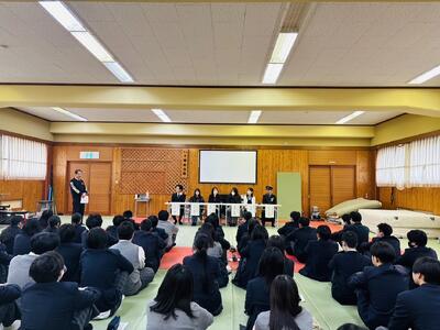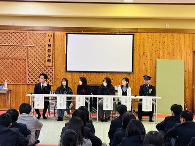 さて本日2~4限、1,2年生を対象とした進路ガイダンスが行われました。今回は、本校を2年前に卒業した49回生の代表メンバーがその講師役を担ってくれました。大学生の立場から小松さん、大北さん、名田さん、専門学校生の立場から宮森さん、公務員就職の大垣さん、JRへ就職した宮元さん…、それぞれの高校生活を振り返りながら、後輩たちに向けたアドバイスや現在の自分について熱く語ってくれました。いやぁ、他の校務で話は聞けませんでしたが、直属の先輩からの話は実にリアルで在校生の心に深く突き刺さるものがあったのではないでしょうか?