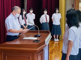 その後、文化祭や球技大会の表彰、生徒会認証式が行われた後、ライフル射撃部全国大会出場の2名(猶原さん、藤原さん)と2日前新たにパソコン部で全国大会出場が決まった宮本大稀くん(3年・千種中出身)の壮行会が行われました。顧問の先生方から3名の紹介があり、全国大会出場に至った経緯を聞く中で3人の真面目な人柄が手に取るようにわかりました。その後、生徒会長の小松煌くん(2年・千種中出身)から在校生を代表した言葉を受け、3名からそれぞれ決意が述べられました。猶原さんは「これが最後の試合なので力をしっかり出し切り、楽しみたい!」と言えば、藤原さんも「初の全国の舞台で緊張するが、それを楽しみます!」と語ってくれました。宮本くんも、「ミスを無くし自己最高を目指したい!」と意欲を示しました。3名の全国大会での頑張りを心から応援しています。頑張ってきてください。
