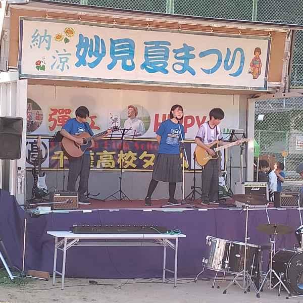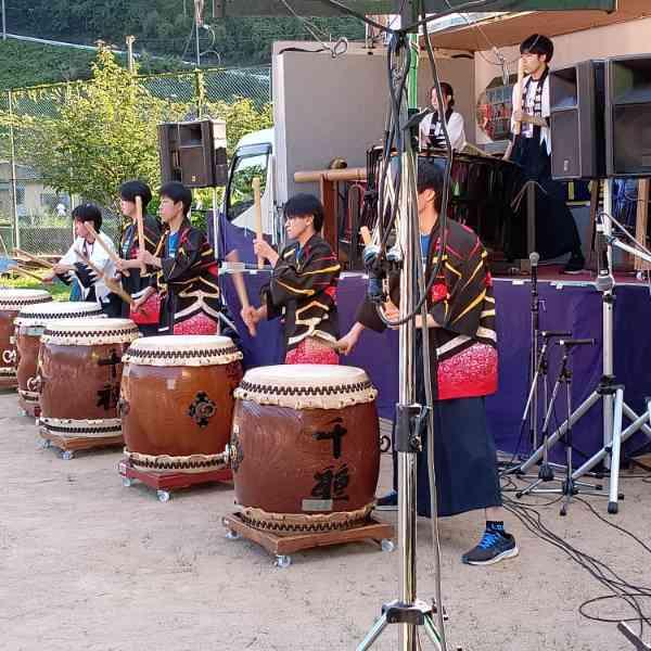 そんな中、妙見夏祭りが千種小学校グラウンドで行われています。そのオープニングを飾ったのがカルチャー部の皆さんによる和太鼓とバンド演奏です。やはり和太鼓はパンチ力があっていいものです。地域の方から「レベルが上がっていますね」と声をかけていただきました。観客もノリノリでオープニングにふさわしい演奏となりました。今年の演奏はステージの最後には3年生の引退セレモニーも行われ、支えてきてもらったことへの感謝が述べられ人徳を感じるところです。このあと20時15分頃から花火大会が予定されています。楽しみましょう。くれぐれも夜道の安全にはご注意ください。