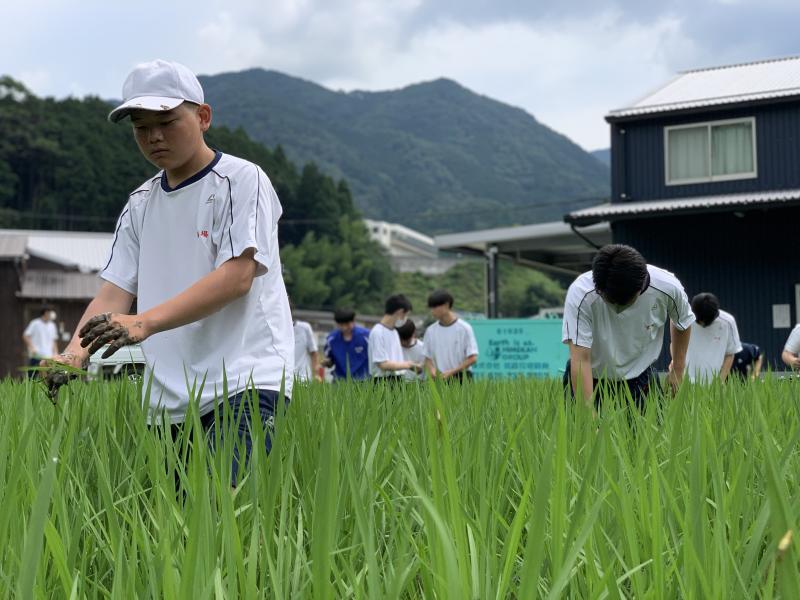 【51回生】田んぼの草取りに挑戦! 投稿日時 : 2023/07/18 教諭(teacher)_1 本日LHRの時間に、田んぼの草取りを行いました。 今回も田住先生より草取りの方法を教えていただきました。 稲一列をまたぎ、その列を維持しながら前へ進み作業を行いました。 最初は、苗と雑草の違いに戸惑っていましたが、時間が経つにつれて慌てず丁寧に草取りすることができたと思います。 稲の収穫まであと約2ヶ月。成長が楽しみですね!!