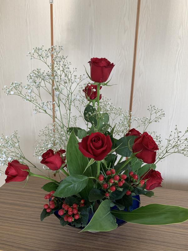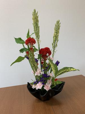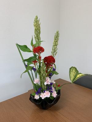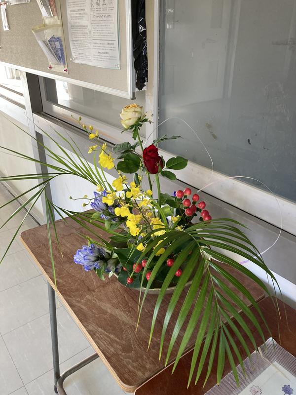 3年生最後の作品です。けいとうの鮮やかな赤が印象的で、カーネーションが足元を彩る素敵な作品に仕上がりました。これからは進路に向けて、頑張れ!
