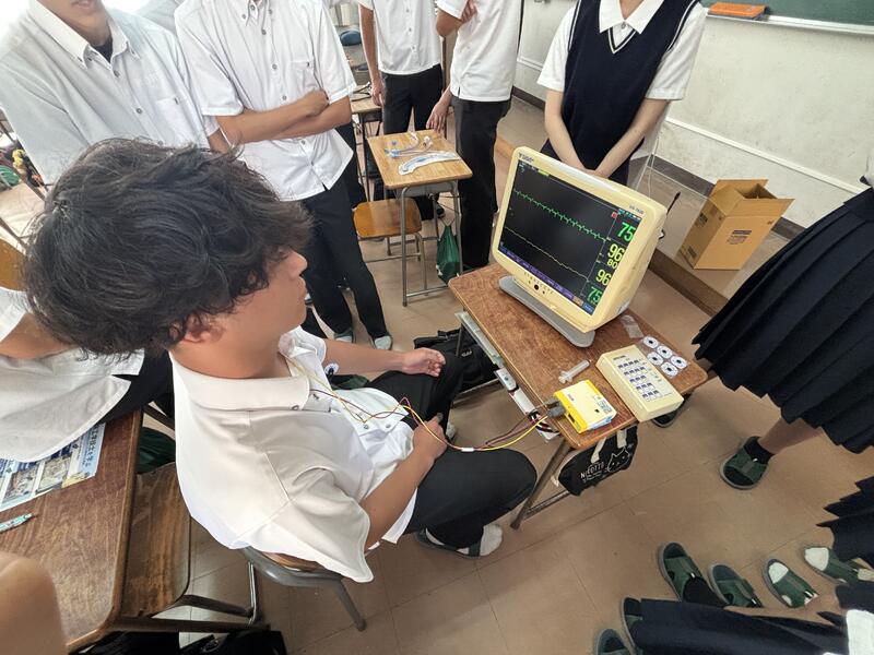 講義の後半は、現場で使われるペアンや心電図モニターを触らせていただきました。実際に電極を装着し、心電図が表示されると、生徒は体を動かして心拍数を上げようとしていました。実際に使われている機材に触れたことで、生徒も楽しそうに講義を受けることができました。