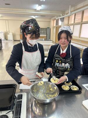 新入部員を迎えての初めての活動では「簡単りんごのケーキ」を作りました。1年生にとっては初めての製菓でしたが、先輩たちに道具の使い方を教えてもらいながら、楽しく調理していました。りんごのシャキシャキ食感や自然な甘みがおいしいケーキが焼きあがっていました。